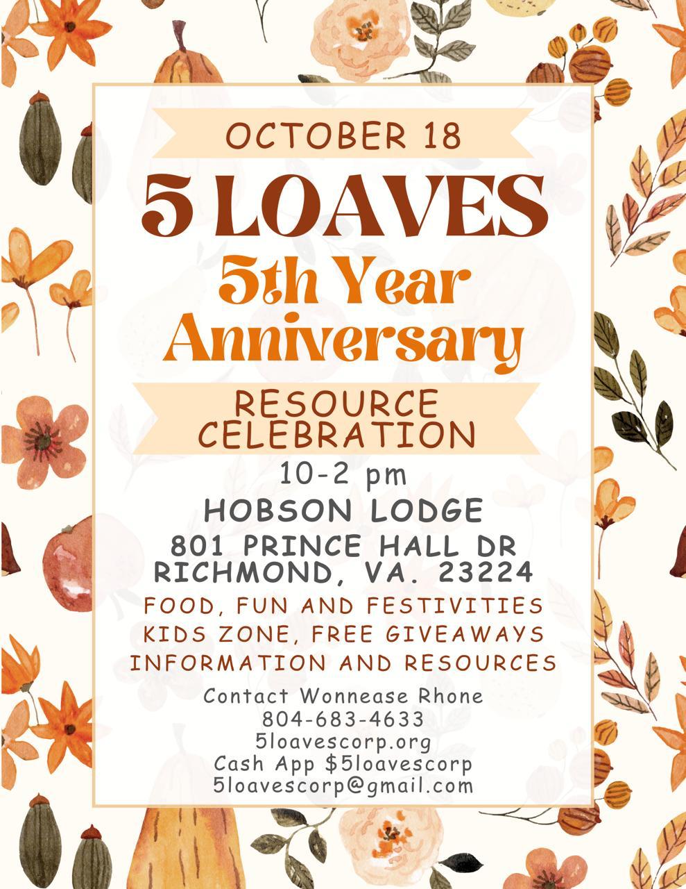 Join us on October 18 from 10:00 AM to 2:00 PM at Hobson Lodge, 801 Prince Hall Dr, Richmond, VA 23224 for a special 5th Year Anniversary Resource Celebration. Enjoy a day filled with food, fun, and festivities, including a kids zone, free giveaways, and helpful information and resources for the community. For details, contact Wonnease Rhone at 804-683-4633, visit 5loavescorp.org, email 5loavescorp@gmail.com, or support via Cash App $5loavescorp